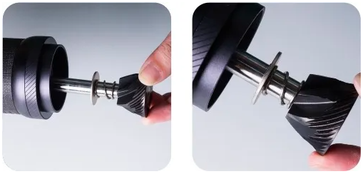 Drej borringsenheden fremad (omvendt gevind). Afmontering af justeringshjulets ring er ikke foreslået. Rengør ikke kværnen med vand. Rengøring med børste og blæser anbefales. |