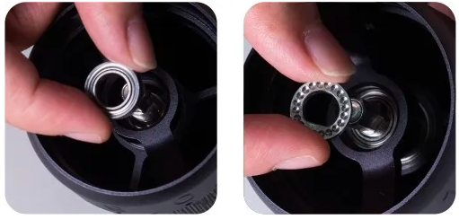 ![]() | Sæt det øverste leje tilbage fra toppen. Mens du trykker på kværnen fra bunden, Sæt det øvre lejedæksel tilbage. Siden med konkave prikker vender opad, og den U-formede hullet passer korrekt til skaftet. |
