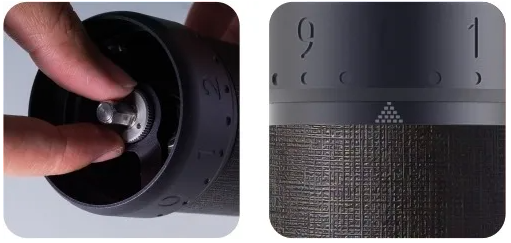 ![]() | Spænd den riflede vingemøtrik for at kalibrere kværnen, mens du trykker på kværnen fra bunden. Bemærk: Der er fire og en halv rotation i alt talt fra startpunktet. Startpunktet kan være være forskellig inden for ±10 klik på grund af den styrke, du strammer møtrikken og drejeknappen. |