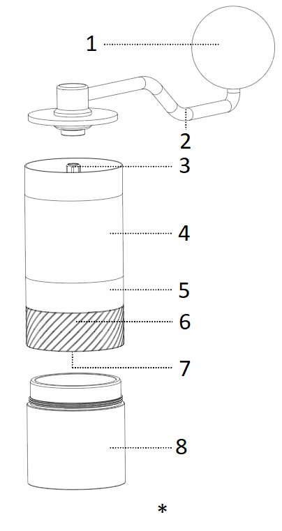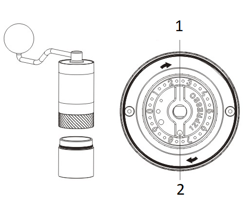 Alle 1Zpresso kværne kan skilles ad uden værktøj. Installer og placer håndsvinget godt, og stop det i at rotere og løsne det. justeringsknappen mod uret for at fjerne den. |