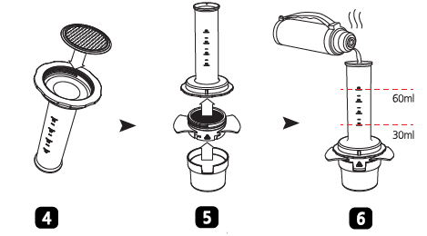 ![]() | KAMMER (Materiale: Polyethersulfon PES) Den graduerede cylinders kammer er lavet af miljøvenligt materiale og bruges til at holde varmt vand. En skala er indgraveret for at måle den nøjagtige vandmængde (30 ml-60 ml) |