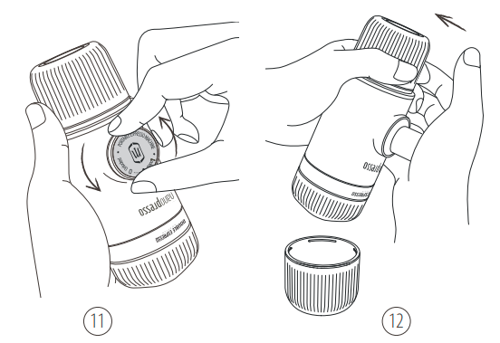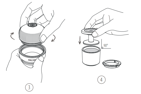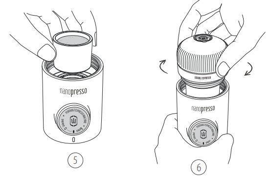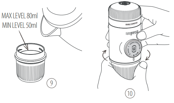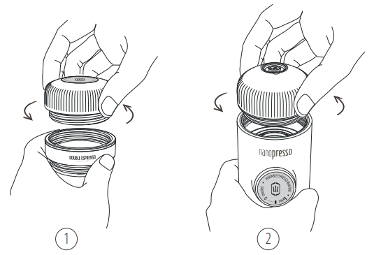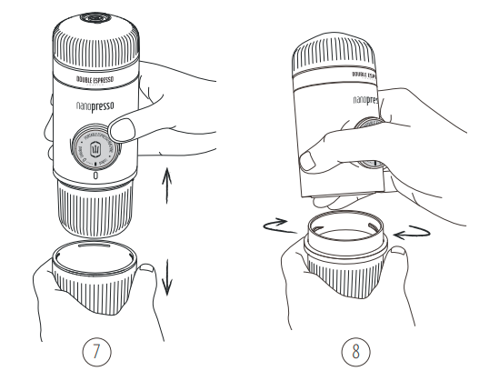 11. Lås stemplet op fra dets bevægelsesposition. 12. Hold NanoPresso med begge hænder, som vist. Begynd at pumpe over en kop. Pump langsomt, indtil al kaffen kommer ud. | ![]() |
